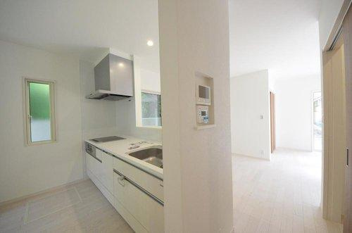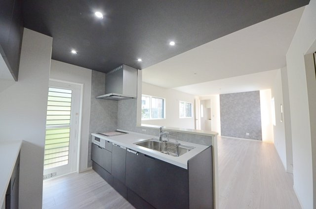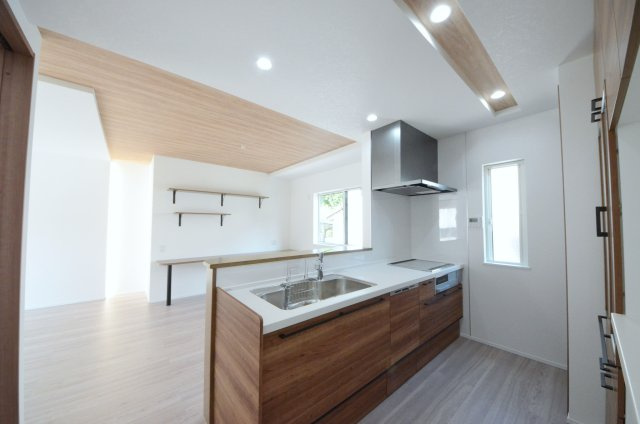 【キッチン】陽当たりが良く、窓の多いリビング空間。オープンタイプの対面式キッチンでリビングが隅まで見渡せます。キッチンにいながら小さなお子様にも目が届き安心です。
