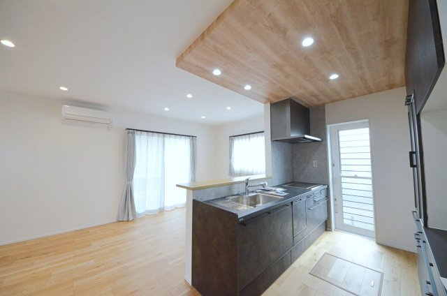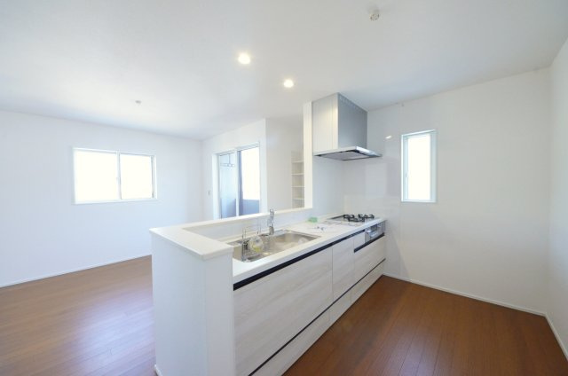 【キッチン】窓の多いリビング空間。オープンタイプの対面式キッチンでリビングが隅まで見渡せます。キッチンにいながら小さなお子様にも目が届き安心です。