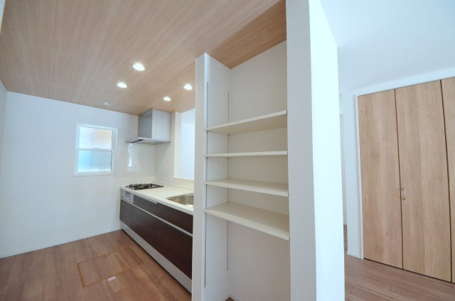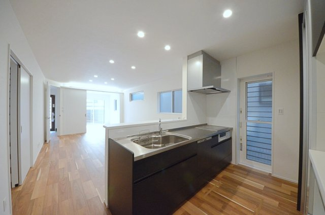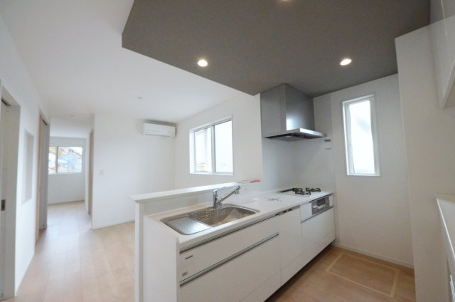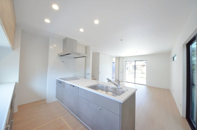 【キッチン】広く明るいリビング空間。オープンタイプの対面式キッチンでリビングが隅まで見渡せます。キッチンにいながら小さなお子様にも目が届き安心です。