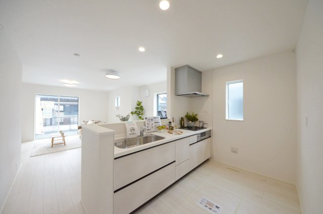 【キッチン】広く明るいリビング空間。オープンタイプの対面式キッチンでリビングが隅まで見渡せます。キッチンにいながら小さなお子様にも目が届き安心です。
