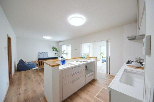 【キッチン】陽当たりが良く、窓の多いリビング空間。オープンタイプのキッチンでリビングが隅まで見渡せます。キッチンにいながら小さなお子様にも目が届き安心です。