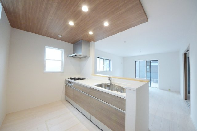 【キッチン】東南向きで陽当たりが良く、窓の多いリビング空間。オープンタイプの対面式キッチンでリビングが隅まで見渡せます。キッチンにいながら小さなお子様にも目が届き安心です。