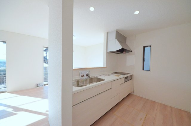 【キッチン】広く明るいリビング空間。オープンタイプの対面式キッチンでリビングが隅まで見渡せます。キッチンにいながら小さなお子様にも目が届き安心です。